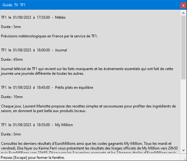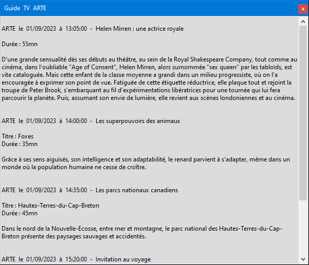 J'ai terminé aussi la lecture du guide TV d'une chaine Free (UUID) et voici le résultat affiché dans une fenêtre dédiée